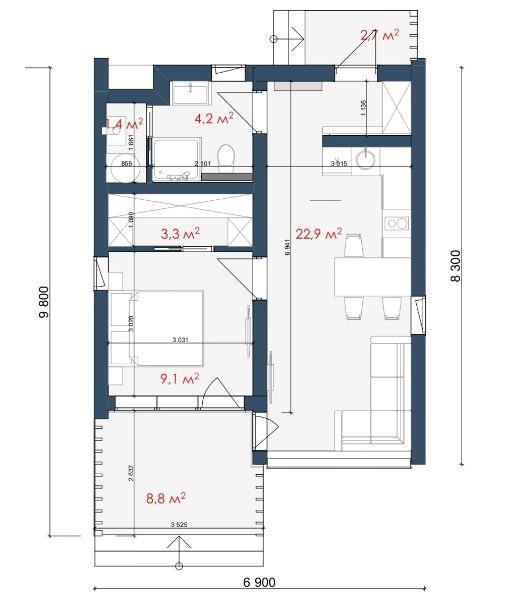 Площа — 43.5 м²